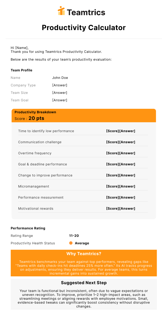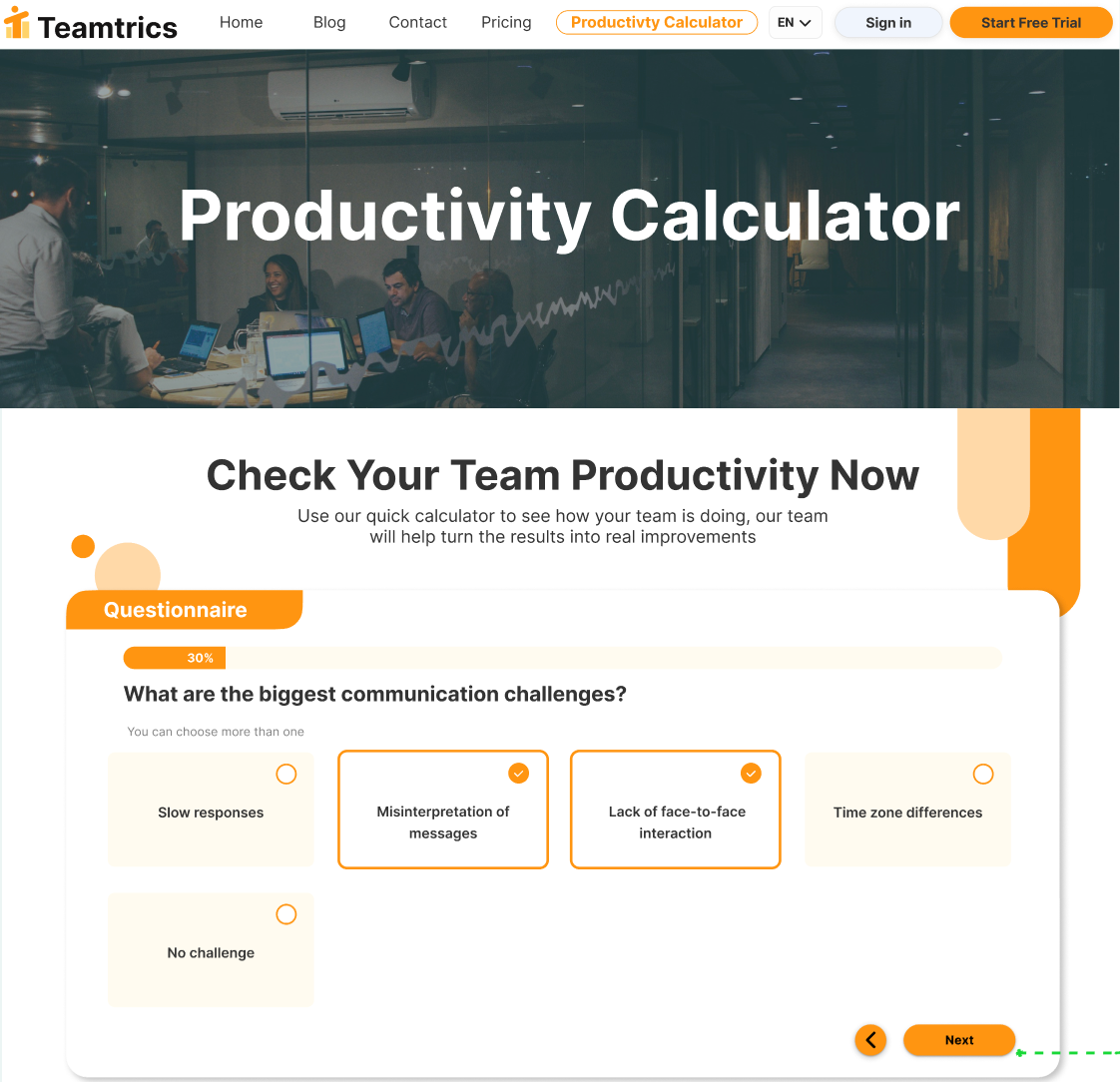 A brand-new Productivity Calculator is now live on our public website. Visitors can answer a quick survey to receive personalized productivity insights, helping them better understand team performance and areas for improvement.